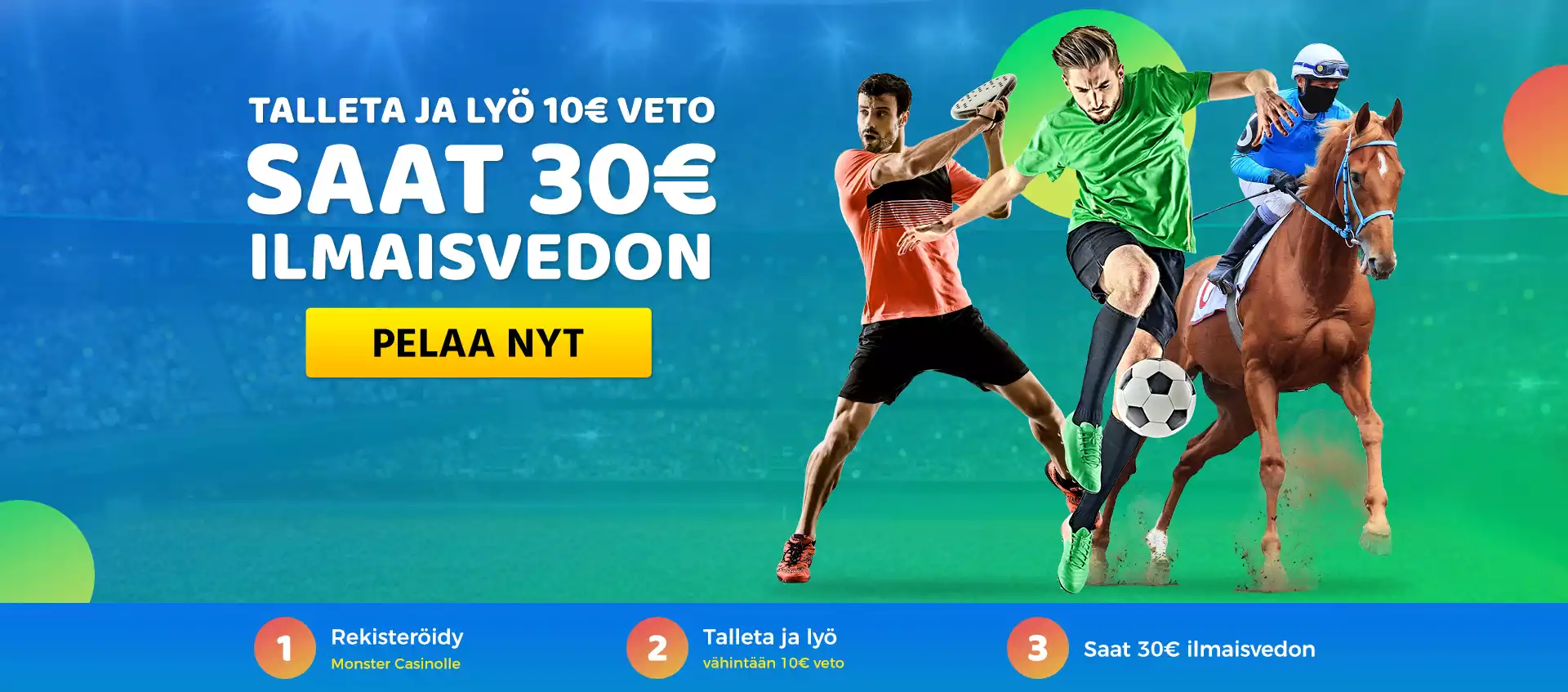 Vain uusille pelaajille. Vähintään 10 € arvosta pelattuja panoksia, panoksia ei palauteta. Ilmaispanos on kertaluontoinen 30 € arvoinen panos, jonka vähimmäiskerroin on 1.5x. Panosta ei palauteta. Voitoille on määritetty 1 kerta kierrätysvaatimus. Panokset pelataan ensisijaisesti oikean rahan saldolla. Kierrätysvaatimus lasketaan vain bonusrahoilla pelatuille panoksille, panokset pelataan ensisijaisesti oikean rahan saldolla. Suurin muuntomäärä on 200 €. Ilmaisveto on käytettävä 7 päivän kuluessa ja bonus 7 päivän kuluessa sen vastaanottamisesta. Nostopyynnöt mitätöivät kaikki aktiiviset / odottavat bonukset. Täydet ehdot ovat voimassa..