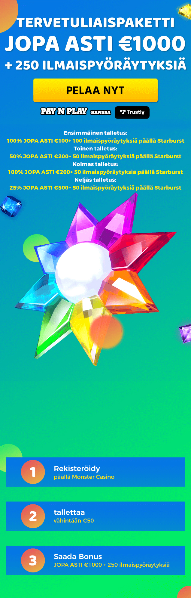 Lyö vetoa ensin oikealta rahalta. Lyö bonusrahat 50 kertaa 30 päivän kuluessa / Ly ilmaiskierrosten voitot 50 kertaa 7 päivän kuluessa. Osallistumisprosentti vaihtelee pelikohtaisesti. Saatavilla vain valituissa peleissä. Kierrätysvaatimus lasketaan vain bonuspanoksista. Bonustarjous ja tarjouksen voitot ovat voimassa 30 päivää / Ilmaiskierrosten voitot ja ilmaiskierrosten voitot ovat voimassa 7 päivää niiden vastaanottamisesta. Maksimimuunnos: 3 kertaa bonussumma tai ilmaiskierrosten voitot: 20 £. Rajoitettu 5 brändiin verkostossa. Nostopyynnöt mitätöivät kaikki aktiiviset/odottavat bonukset. Skrill- ja Neteller-talletukset eivät ole voimassa. Täydelliset ehdot ovat voimassa.